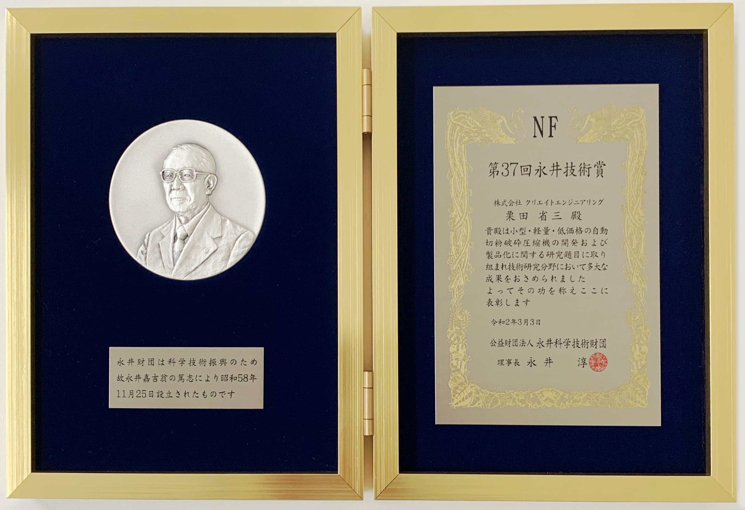 2020年3月3日、弊社の自動切粉破砕圧縮機NEOPACKが公益財団法人 永井科学技術財団主催 第37回永井財団表彰において永井技術賞を受賞しました。