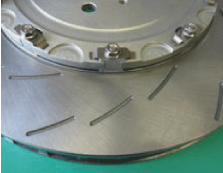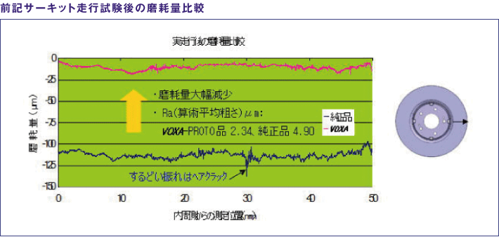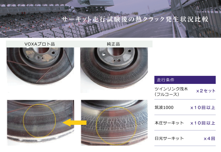 プロトタイプ(スリット形状等が生産品と若干異なる)を使用しサーキットで純正品との比較評価を行った結果、熱クラックの発生が大幅に抑えられ、磨耗が均一で磨耗量が大幅に減少しております。