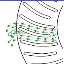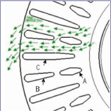 内周側に飛び出たビュレットフィンAと、Aより少し引っ込んだビュレットフィンCの構成により空気を取り入れる間口が拡がります。ここから取り入れた空気は、ビュレットフィンAの前面に沿って流れる空気と、ビュレットフィンCの前面に沿って流れる空気に分離されます。