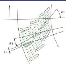 空気の流入角に近いセット角θ1を持つ第一フィン、少し小さいθ2、更に小さいθ3を持つ第二、第三のフィンで構成されています。このθの三段構造が流れのよどみが出来にくくなるように作用します。
