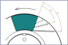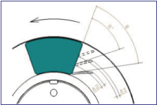 ブレーキローターの回転に伴うブレーキパッドとスリットの交差角「θ」の変化(θ→θ'→θ"への変化)が少なく、ざらざら感のない滑らかなブレーキタッチが得られます。