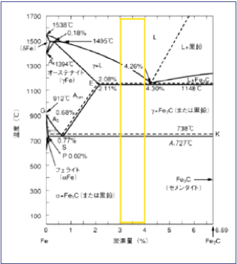 ブレーキローター用材料として多く使用されているFC150〜250材(引張り強さ*1が150〜250N/mm2の材料)の場合、通常は材料中に重量比で炭素(カーボン)が約3〜4%含有されています(右図の黄色の枠参照)。この図が示すとおり融点が1300℃程度であり温度の低下に伴いγ(オーステナイト)層が析出し1150℃付近のAcm変態点を過ぎるとFe3C(セメンタイト)*2や黒鉛(炭素)が析出し始めます。