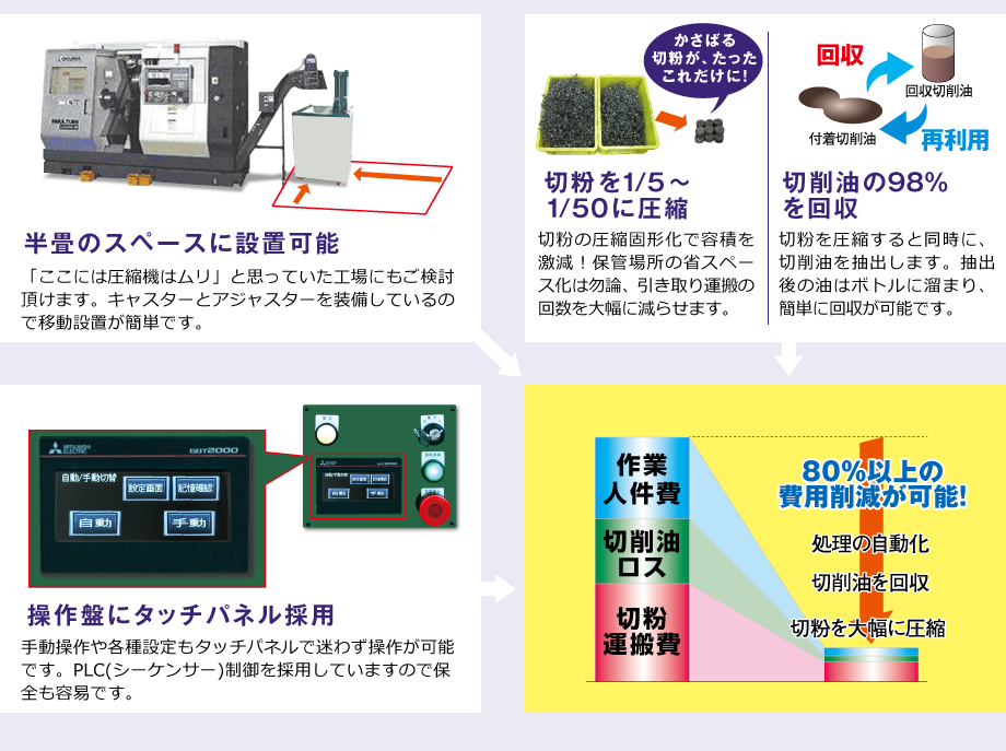 月間4tの切粉が発生している工場を想定しますと、切粉回収頻度の減少、廃棄切削油の削減、切粉処理人件費の削減などで、およそ年間70〜130万円程度のコストダウンが期待出来ます。 |