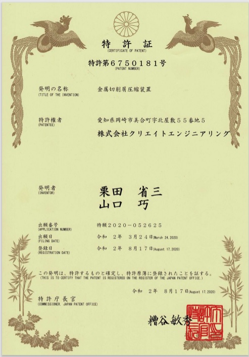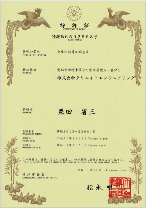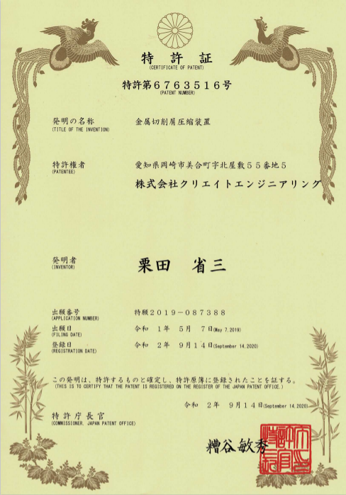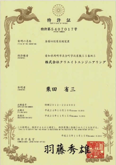 弊社の金属切削屑圧縮装置で特許を取得しました。